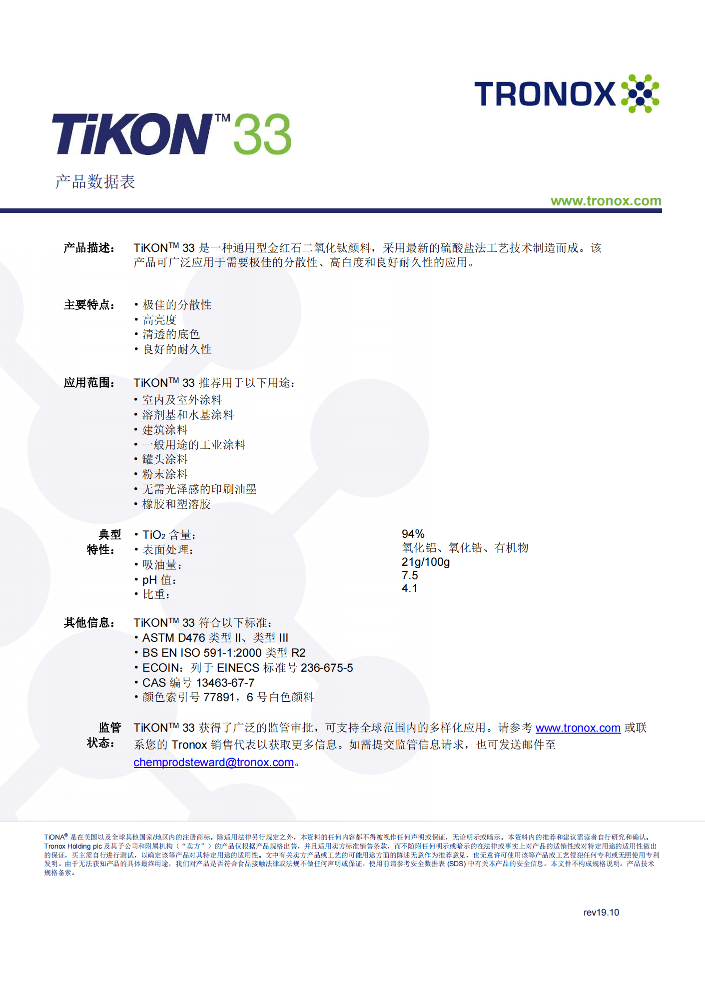 TiKON 33 是一种通用型金红石二氧化钛颜料,采用最新的硫酸盐法工艺技术制造而成。该